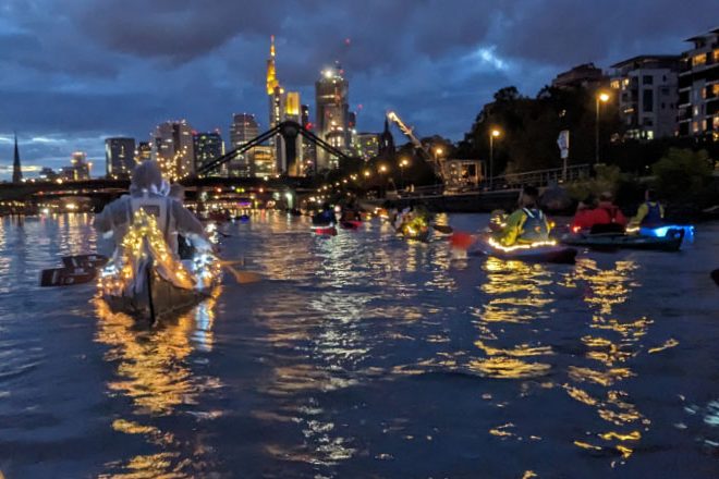 Mit nur drei Booten auf dem Dach ging es schon am Nachmittag auf zum ESV-Frankfurt zu deren 40. Funzelfahrt auf dem Main. Ich hatte mir gar nicht so recht ausgemalt, welcher Aufwand da traditionell betrieben wird, beim Schmücken der Boote. So habe ich morgens nur schnell zwei Lichterketten mit Batterien geschnappt und wähnte mich gut…