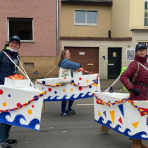 Tage vorher wurde Material besorgt und verarbeitet, Pappe beklebt und bepinselt mit Hilfe von Andy, Sabine, Alex, Nils, Lina und Jörg und alles bestens organisiert von unserem Fahrtenwart Toby, der auch die Idee dazu hatte.