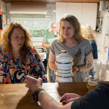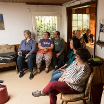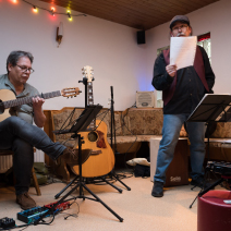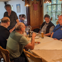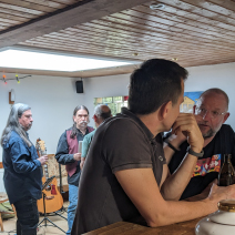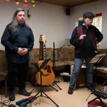 Und dann legen sie los und es wird ganz still – alle hören gebannt zu und es brandet schon nach dem ersten Song toller Applaus los. Die Stimmung steigt mit jedem Song, manchmal kann man auch was mit singen. Wir sind alle beseelt von der tollen Musik, Peters Gitarrenspiel und Dieters Gesang und Percussion sind beeindruckend. Am Ende sind wir so beschwingt, dass wir einfach noch weiter feiern. Ein toller Abend und wir sind uns alle einig, das können die beiden gerne wiederholen in unser aller Wohnzimmer.