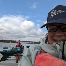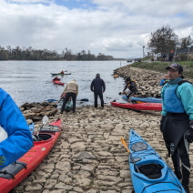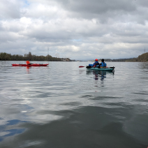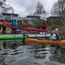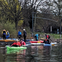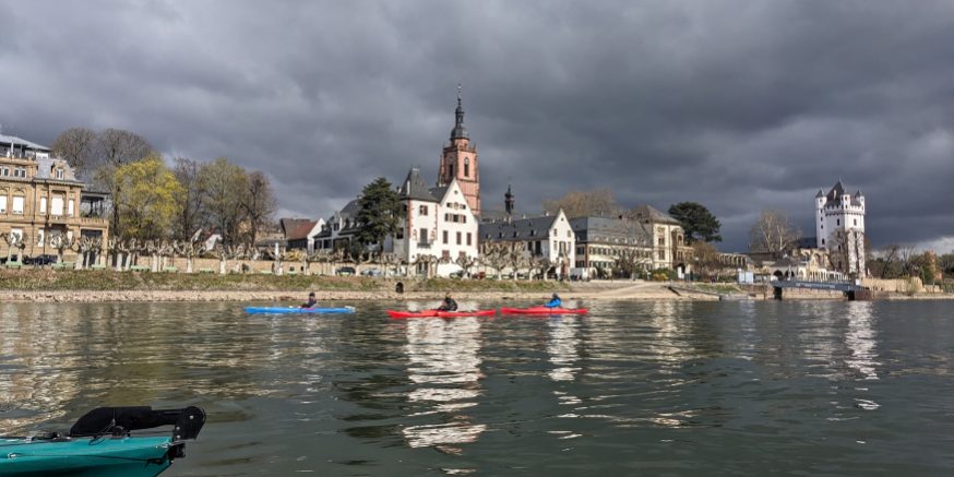 Erstmal zum WKV in Biebrich, alle raus zu Ansprache, Sekt und Bio-Pause. Alte und neue Kumpels werden begrüßt, Abenteuer und Schnittchen geteilt. Dann alle wieder raus aufs Wasser, das bedeutet Boote schleppen, auf Leute warten, Platz machen, einsteigen helfen. Der Zweier treibt schon weit vorne, einer wartet hinten auf den Pulk, dreie warten auf den Wartenden. Unser verantwortungsvoller Wanderwart droht der autonomen Szene mit allerlei digitalen Überwachungstools. Warum nicht gleich an die Leine legen? „Komm hol das Lasso raus…“, da haben wir unser Wanderpaddellied.