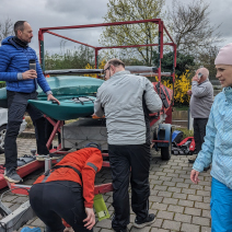 An der Rampe in Erbach stehen schon die hilfsbereiten Kumpels vom Verein, um uns raus zu ziehen. Nur noch mit den Bootswagen durch die Unterführung, wo schon unser Hänger wartet. Jetzt kommt die Hauptarbeit: Boote aufladen und festbinden. Dann endet dieser schöne Ausflug mit Süppchen und Kuchen bei unserem freundlichen Gastgeber, dem Erbacher Kanuverein. Ahoi.