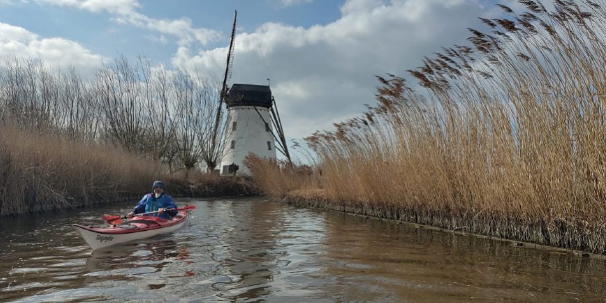 Die Besetzung ist international, von polnisch über flämisch bis französisch. Es gibt Rennboote, Wildwasserboote, Kanadier und Wanderboote wie unsere. Als es los geht, sind wir ganz steif von der Kälte. Wir paddeln durch Schilf. An Kreuzungen weisen uns die Schilder des BKK, des Brugse Kayak Klub den Weg, bis wir in einen Stau kommen.